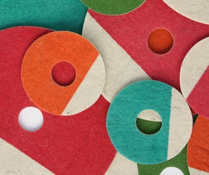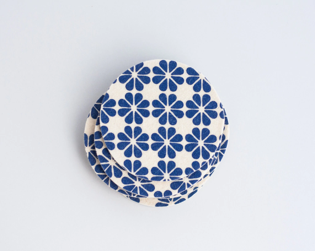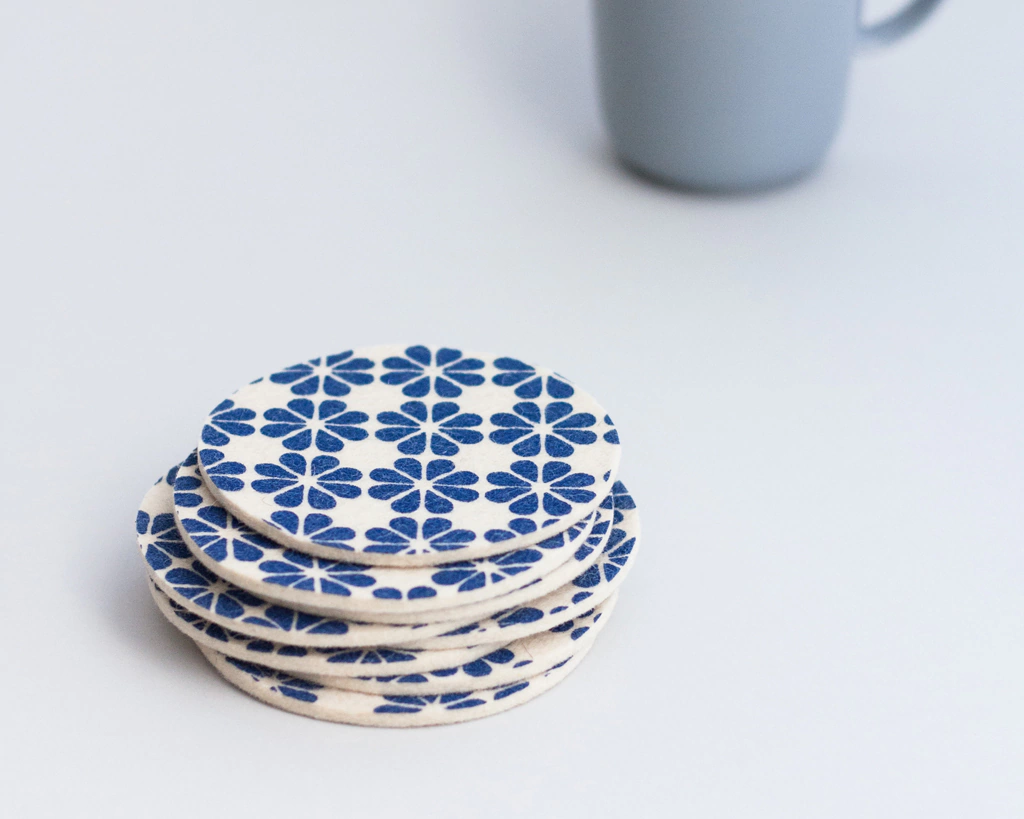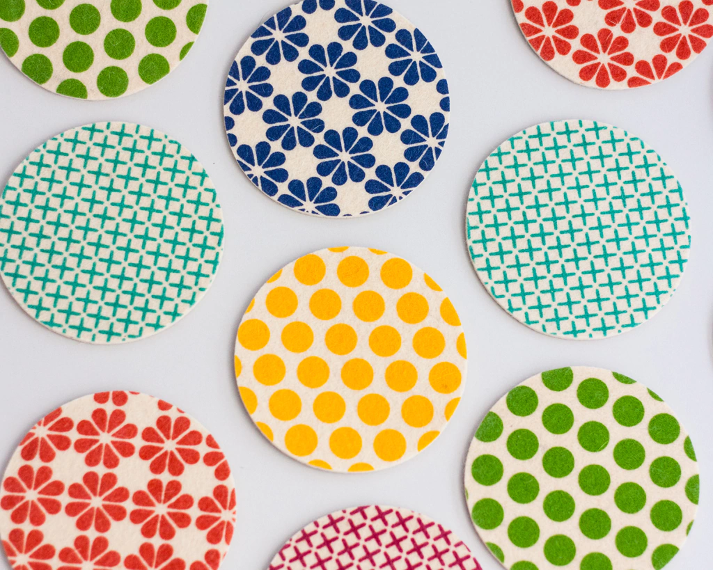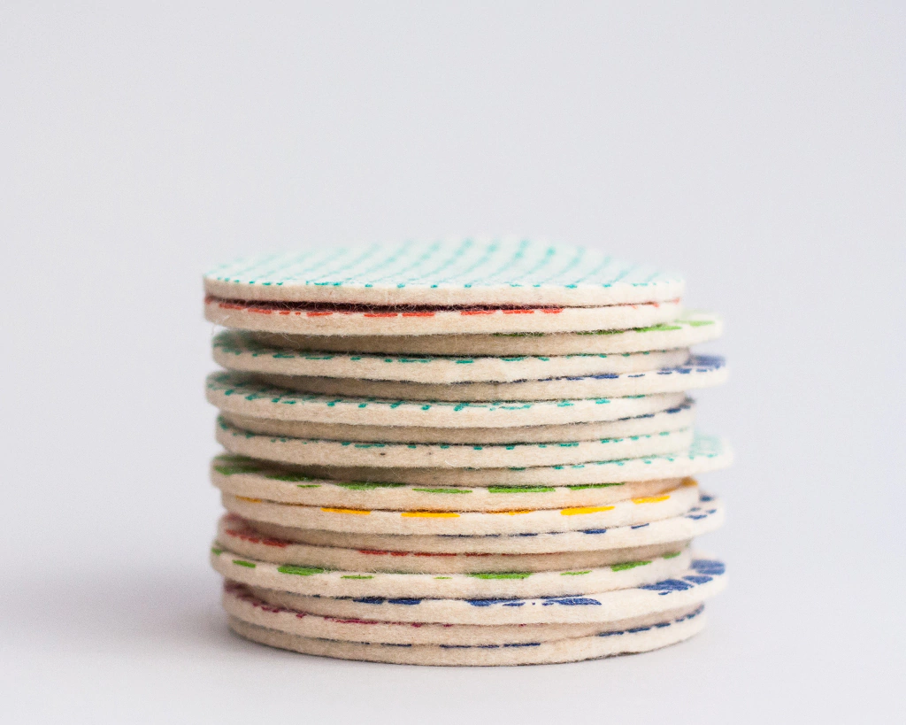 Círculos de fieltro de lana industrial, estampados con tintas al agua. Aísla el calor y el frío permitiendo el apoyo de vasos y tazas calientes. El fieltro es orgánico y biodegradable.